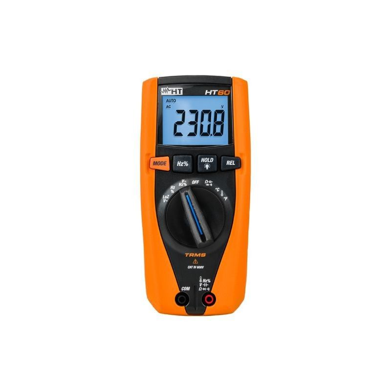 Professionell digital TRMS-multimeter med LCD-skärm med 4000 mätpunkter. Den utför huvudsakligen DC / AC TRMS-spänningsmätningar. Bland instrumentets många funktioner ingår mätningar av kapacitet, frekvens, temperatur med typ K-sond, diodtest, arbetscykel etc. HT60TRMS-multimetern har ett läshåll, relativ mätning. Multimetern har en automatisk avstängningsfunktion för att bevara det interna batteriets livslängd. Den uppfyller den maximala överspänningskategorin CATIV 600V och elsäkerheten EN61010-1